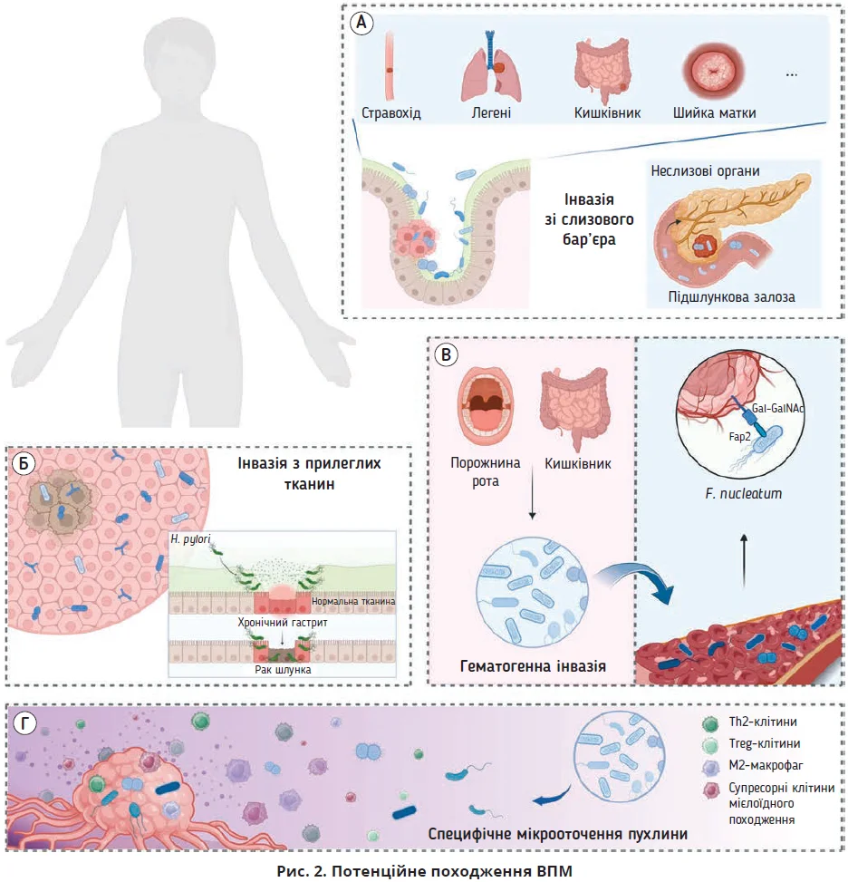 Основним джерелом є інвазія крізь слизовий бар’єр із проникненням мікробів у пухлину через пошкоджену слизову оболонку. Запропоновано бактерійну модель «водій – пасажир», у якій «водіями» є бактерії роду Bacteroides родини Enterobacteriaceae, які колонізують кишківник і стимулюють утворення пухлини. Зі зміною мікросередовища бактерії-«водії» поступово замінюються бактеріями-«пасажирами» – умовно-патогенними коменсалами або пробіотичними мікроорганізмами, які впливають на прогресування пухлини. Багато мікробів колонізують слизові оболонки стравоходу, легень, товстої кишки та шийки матки. Встановлено наявність ВПМ у неслизових органах, зокрема в підшлунковій залозі, внаслідок транслокації з кишкового тракту через панкреатичну протоку (рис. 2А).