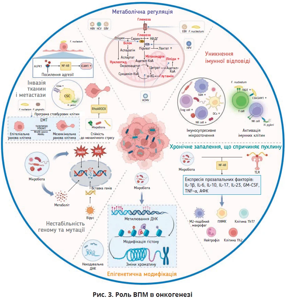 Прогресування раку зумовлене тим, що пухлинні клітини здатні підтримувати проліферацію, уникати пригнічення росту, протистояти апоптозу, забезпечуючи реплікативне безсмертя, індукувати ангіогенез, інвазію й метастазування. Хоча потенційна роль ВПМ в ініціюванні та прогресуванні раку залишається незрозумілою, вона може полягати в модуляції основних канцерогенних функцій між злоякісними та незлоякісними клітинами. Для пояснення ролі ВПМ в ініціюванні та прогресуванні раку запропоновано шість механізмів: 1) нестабільність геному та мутації; 2) епігенетична модифікація; 3) хронічне запалення; 4) уникнення впливу імунної системи; 6) регуляція метаболізму; 7) активація інвазії та метастазування (рис. 3). Розуміння механізмів є вирішальним для прогнозу й лікування раку.