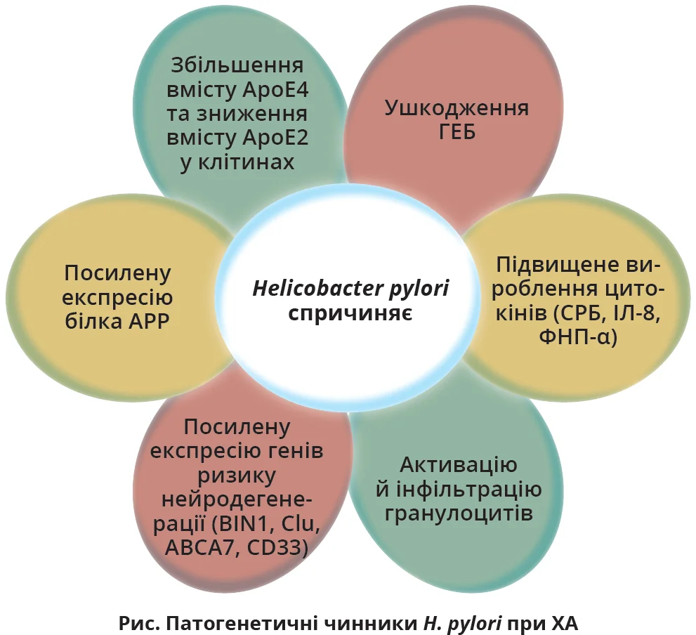 Отже, H. pylori спричиняє численні системні та нейрональні порушення, котрі потенційно прискорюють розвиток ХА (рис.). Вплив цієї інфекції на запалення, генетичну експресію та бар’єрні системи організму є важливими патогенетичними механізмами, що потребують подальшого вивчення.